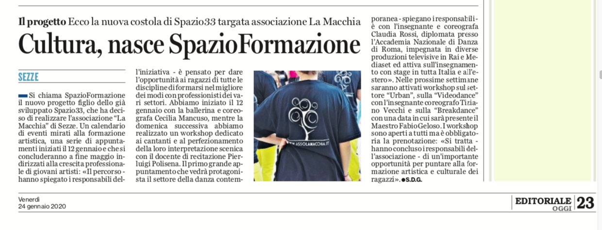 Si chiama “SpazioFormazione” il nuovo progetto figlio dello già sviluppato Spazio33, che ha deciso di realizzare l’associazione “La Macchia” di Sezze. Un calendario di eventi mirati alla formazione artistica, una serie di appuntamenti iniziati il 12 gennaio e che si concluderanno a fine maggio indirizzati alla crescita professionale di giovani artisti: «Il percorso, hanno spiegato i responsabili dell’iniziativa – è pensato per dare l’opportunità ai ragazzi di tutte le discipline di formarsi nel migliore dei modi con professionisti dei vari settori. Abbiamo iniziato il 12 gennaio con la ballerina e coreografa Cecilia Mancuso, mentre la domenica successiva abbiamo realizzato un workshop dedicato ai cantanti e al perfezionamento della loro interpretazione scenica con il docente di recitazione Pierluigi Polisena. Il primo grande appuntamento che vedrà protagonista il settore della danza contemporanea – spiegano i responsabili – è con l’insegnante e coreografa Claudia Rossi, diplomata presso l’Accademia Nazionale di Danza di Roma, impegnata in diverse produzioni televisive in Rai e Mediaset ed attiva sull’insegnamento con stage in tutta Italia e all’estero». Nelle prossime settimane saranno attivati workshop sul settore “Urban”, sulla “Videodance” con l’insegnante coreografo Tiziano Vecchi e sulla “Breakdance” con una data in cui sarà presente il Maestro Fabio Geloso.