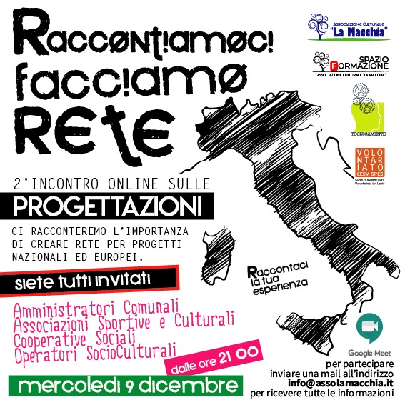 I feedback raccolti nel corso del primo evento intitolato “Raccontiamoci. Facciamo rete” hanno spinto i responsabili dell’associazione “La Macchia” di Sezze a dare seguito all’iniziativa, programmando già un secondo incontro virtuale. L’idea alla base resta quella di un confronto con realtà simili ma collocate all’interno di diversi territori, che in questo momento stanno attraversando una fase complicata a causa delle restrizioni dovute all’emergenza sanitaria. Una serie di punti critici che si cerca di risolvere con suggerimenti e con nuove idee. Non un semplice sfogatoio, però, ma un ragionamento più complesso, che si spera possa portare a importanti forme di collaborazione e, in ultima analisi, anche alla stipula di una vera e propria rete all’interno della quale, ognuno con le proprie competenze e con le proprie caratteristiche, si possano individuare progetti comuni e ragionare sulle esigenze di tutti, ognuno diverso dall’altro sia per indole che per il territorio in cui lavorano. Proprio per questo motivo e, come detto, forti del risultato ottenuto la scorsa settimana in termini di disponibilità e di aiuto concreto alle tante associazioni che hanno aderito, i responsabili dell’associazione “La Macchia”, Gianluca Panecaldo e Pierluigi Polisena, hanno organizzato un secondo evento, che si svolgerà lunedì 7 dicembre a partire dalle 21 sulla piattaforma Google Meet, già utilizzata per realizzare la prima assemblea virtuale. Soddisfazione per questo nuovo progetto è stata espressa proprio dal presidente Panecaldo e dal direttore artistico di Spazio33 Polisena, che hanno spiegato: “Un confronto tra sodalizi associativi in questa fase è fondamentale e la nostra idea di rete si sta concretizzando grazie alla disponibilità di tantissime associazioni che in questo momento trovano enormi difficoltà e cercano di risalire la china. Dal canto nostro – hanno concluso i responsabili dell’associazione di Sezze – ci siamo messi a disposizione nel raccontare le nostre esperienze e per coordinare una serie di interventi che pensiamo possano sostenere questa idea”.